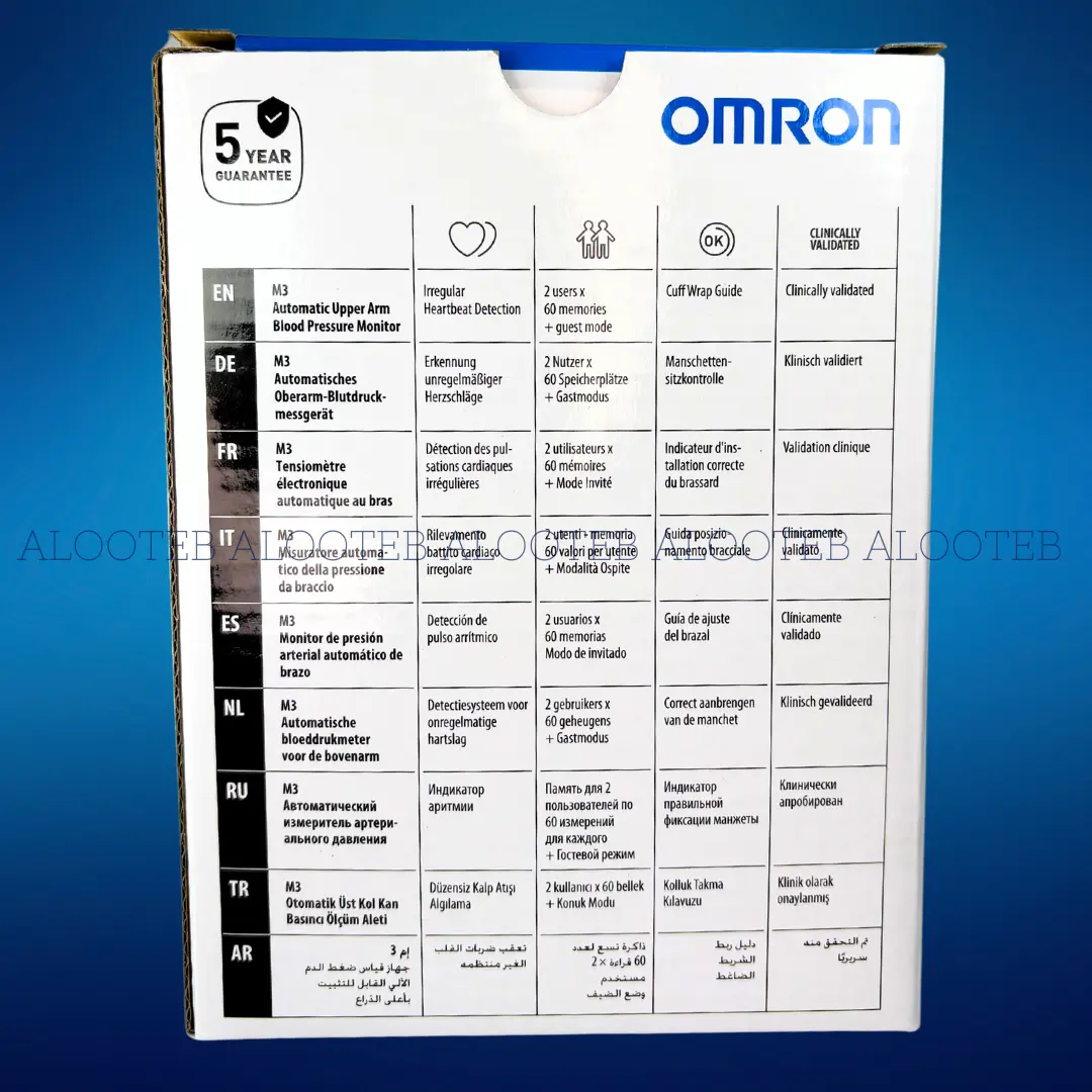 فشارسنج بازویی Omron M3 مدل جدید تر M2 و M2+ بوده و یک دستگاه پزشکی خانگی پیشرفته با نمایشگر بزرگ است که علاوه بر اندازهگیری فشار خون، ضربان قلب، تاریخ و ساعت را نیز به نمایش میگذارد. این مدل ویژه برای دو کاربر طراحی شده و قادر به ذخیرهسازی تا 60 تست بهصورت مجزا برای هر کاربر است، که مجموعاً 120 حافظه را در اختیار کاربران قرار میدهد. این ویژگی آن را به انتخابی ایدهآل برای خانوادههایی که چند بیمار مبتلا به فشار خون دارند، تبدیل میکند. کاف این دستگاه برای دور بازوهای 22 تا 42 سانتیمتری مناسب است، که این اندازهگیریها را دقیق و راحت میسازد.